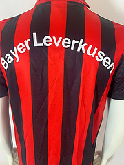 - Klassisches Design 2001-2002: Das Trikot zeigt die traditionellen Farben Rot und Schwarz von Bayer Leverkusen, mit dem markanten Adidas-Logo und den typischen Sponsorenlogos dieser Ära.